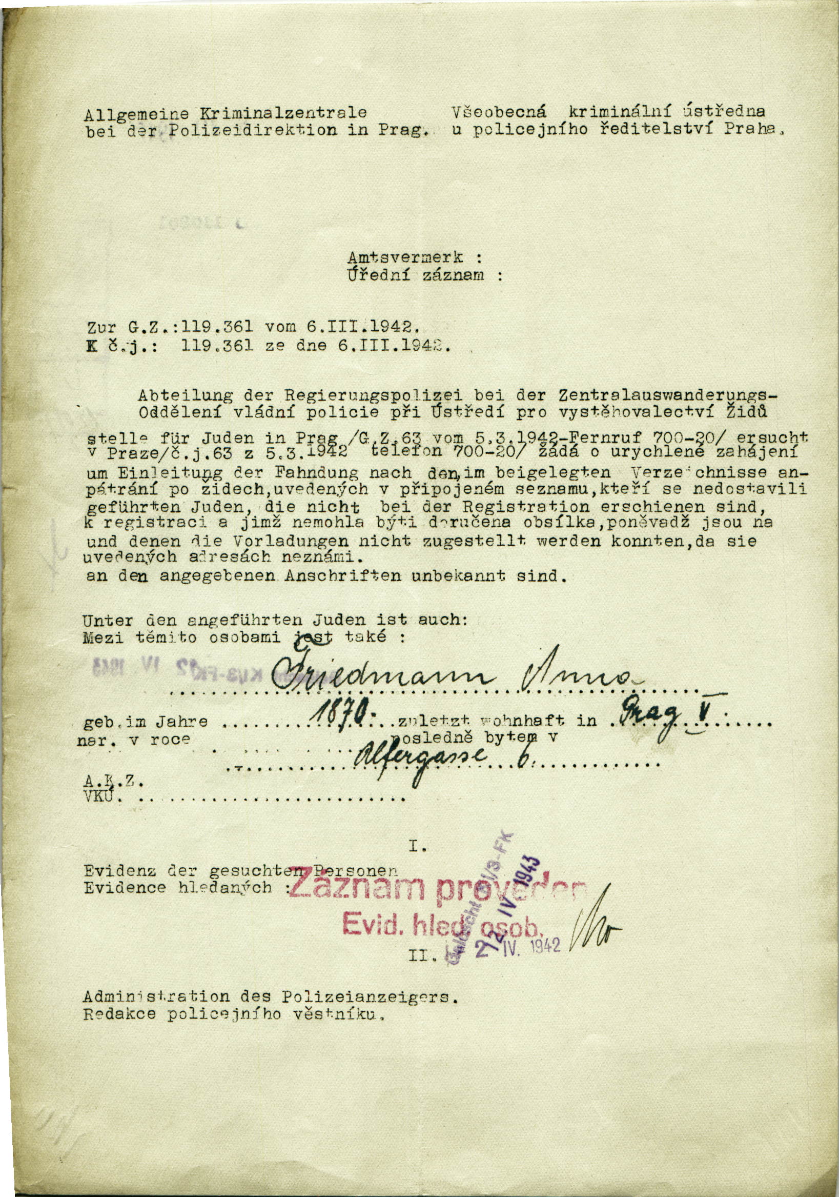 National archives Prague > Police Directorate Prague > 1941-1950 > F > Friedmannová Anna