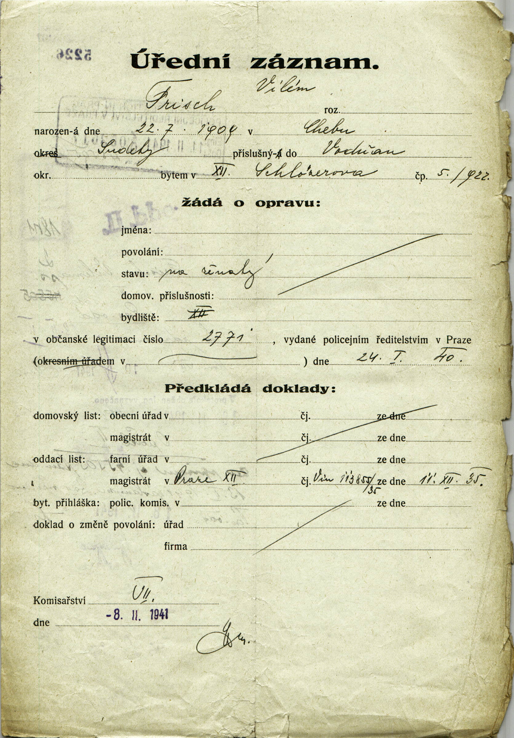 Frisch Vilém: Žádost o opravu v občanské legitimaci