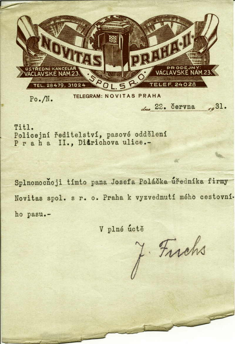 Fuchs Josef: Zplnomocnění k vydání cestovního pasu