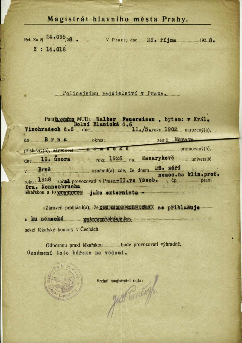 Feuereisen Valtr: Ohlášení lékařské praxe