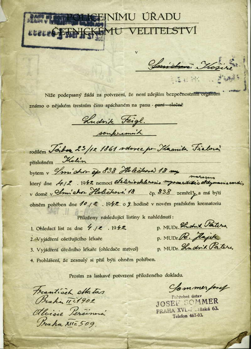 Feigl Ludwig: Žádost o potvrzení k pohřbení ohněm