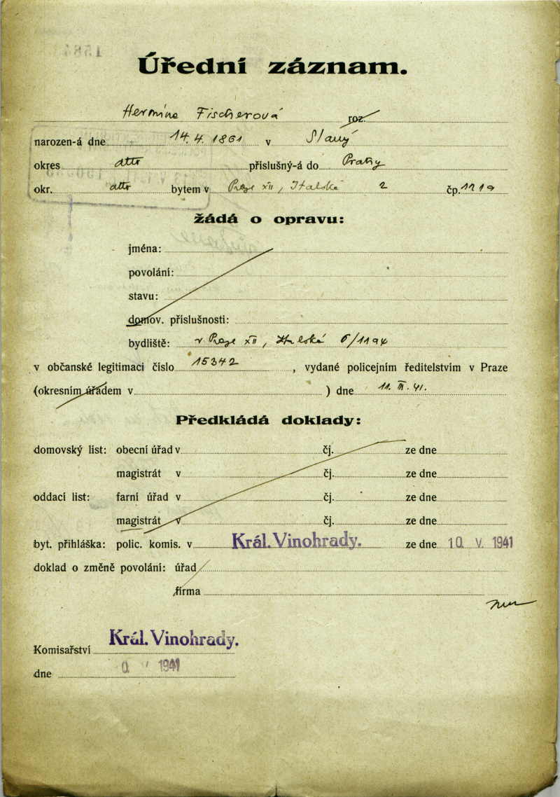 Fischerová Hermine: Žádost o opravu v občanské legitimaci
