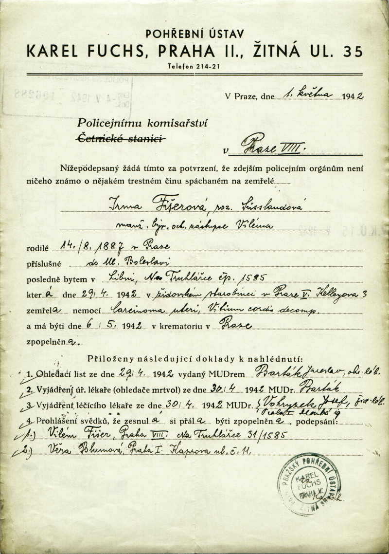 Fischerová Irma: Žádost o potvrzení k pohřbení ohněm