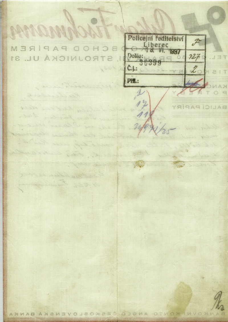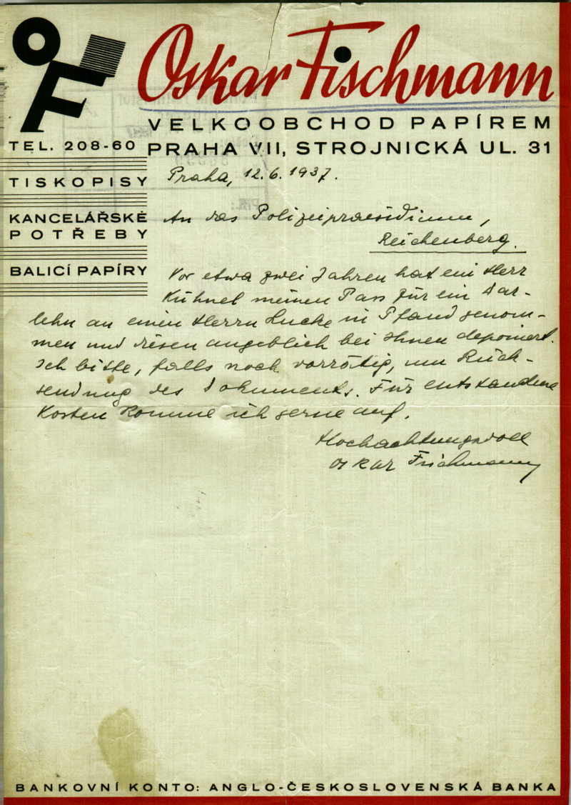 Fischmann Oskar: Žádost o zaslání cestovního pasu