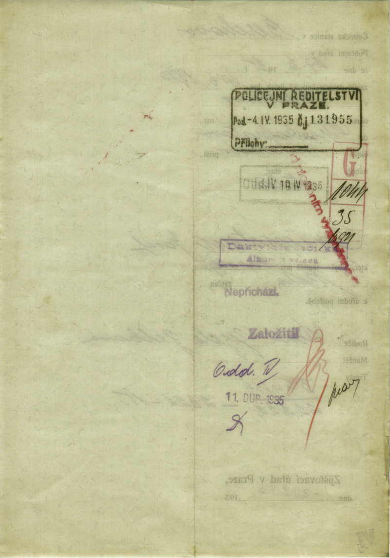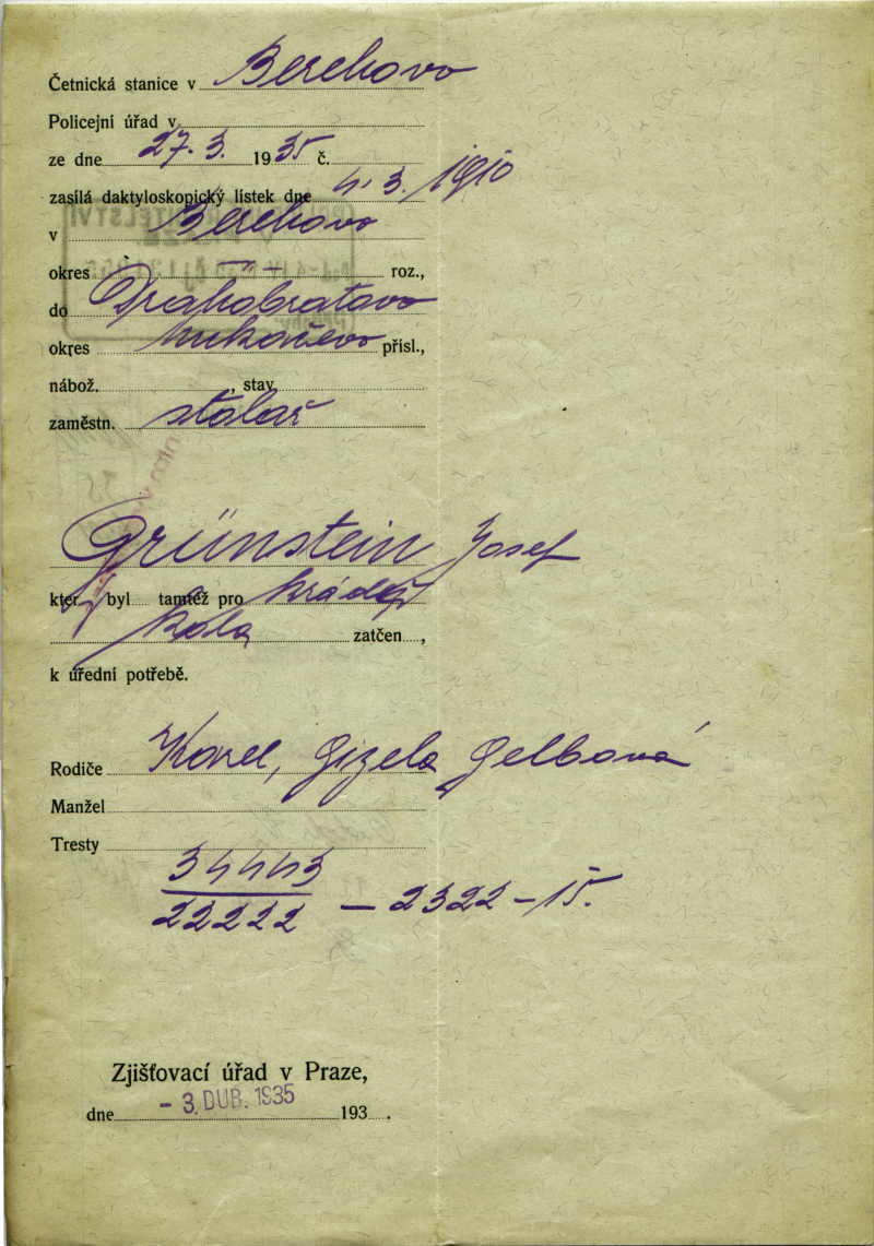 Grünstein Josef: Zpráva o zaslání daktyloskopického lístku