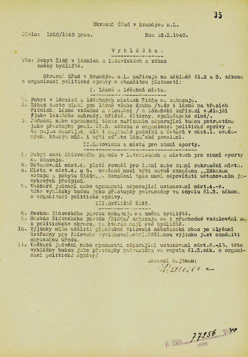 Zákaz pobytu Židů v lázních a letoviskách a zákaz změny bydliště v Brandýse nad Labem