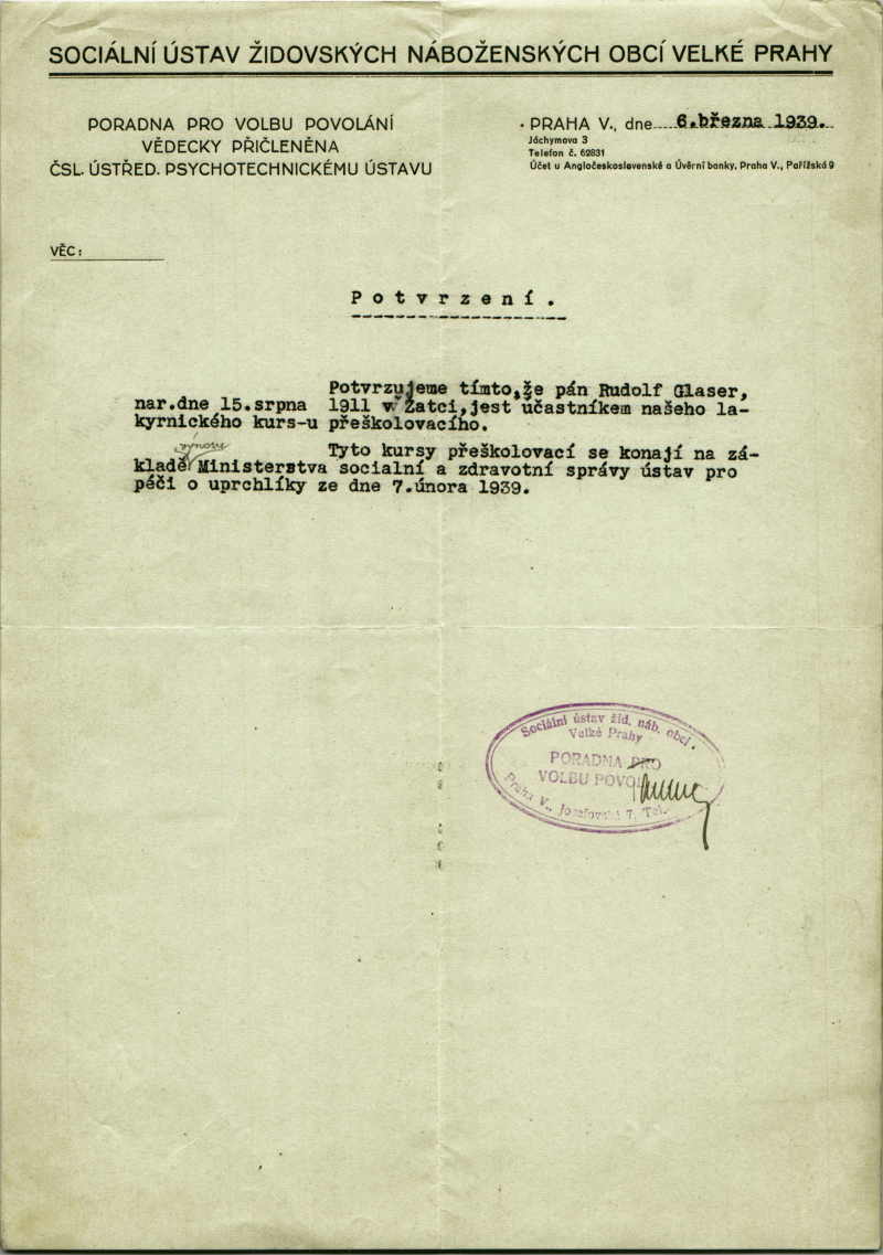 Glaser Rudolf: Potvrzení účasti na přeškolovacím kurzu