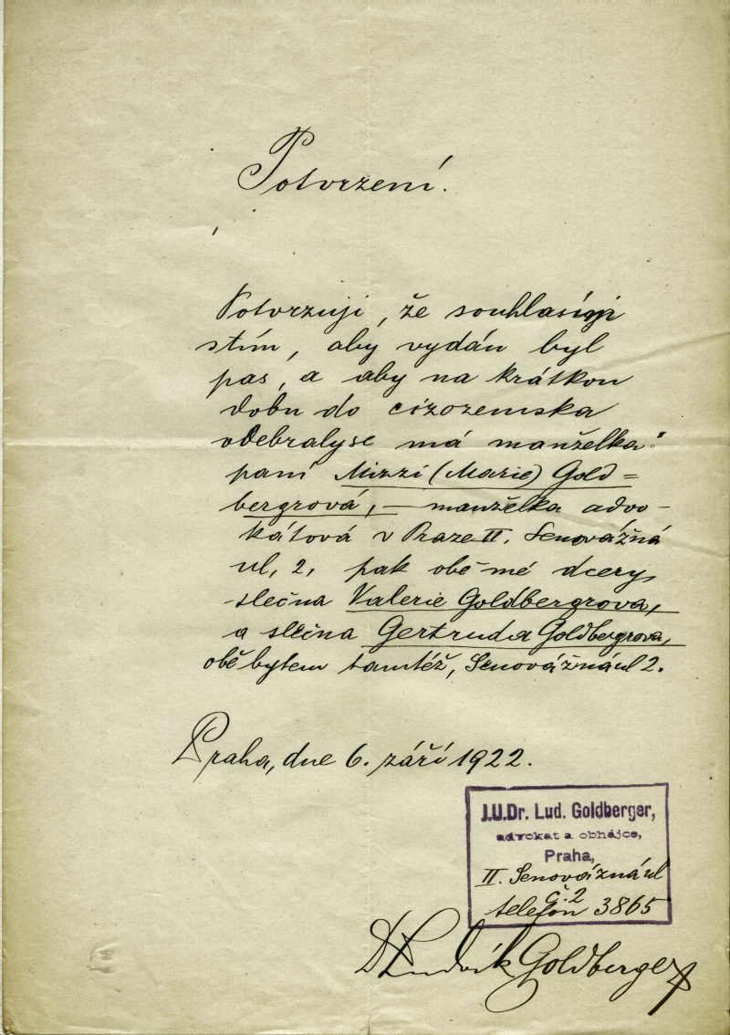 Goldbergerová Marie: Souhlas s vydáním cestovního pasu