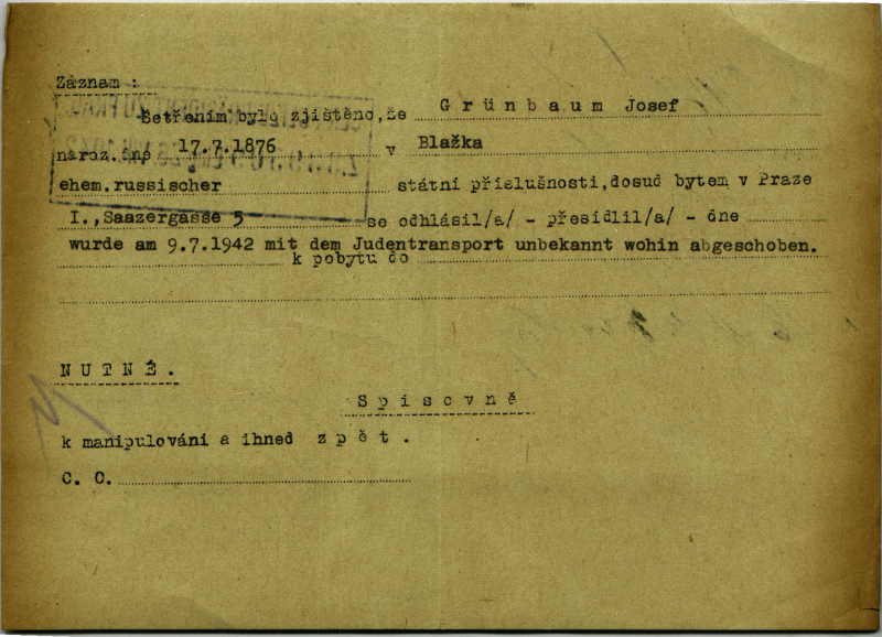 Grünbaum Josef: Investigation of residence of deported Jews