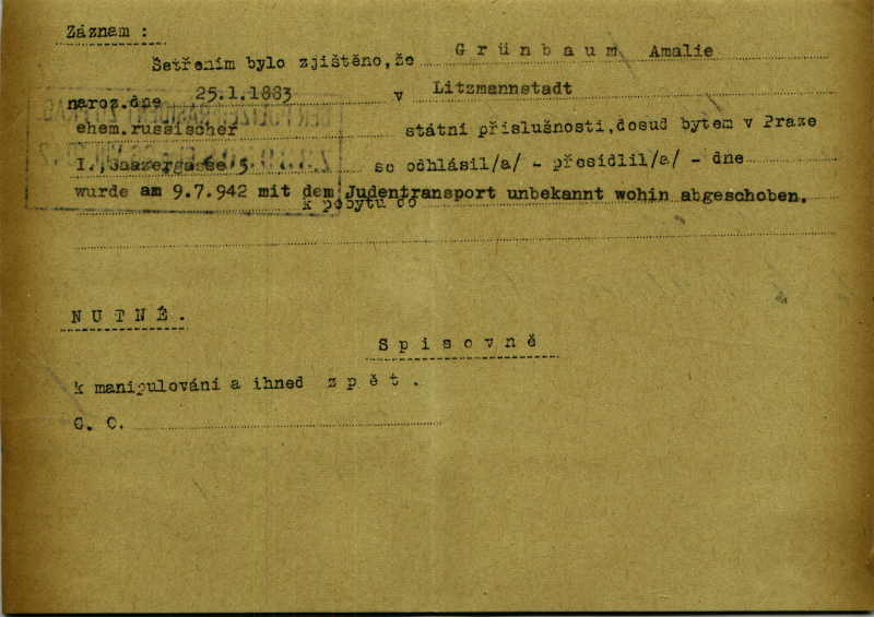 Grünbaumová Amálie: Investigation of residence of deported Jews