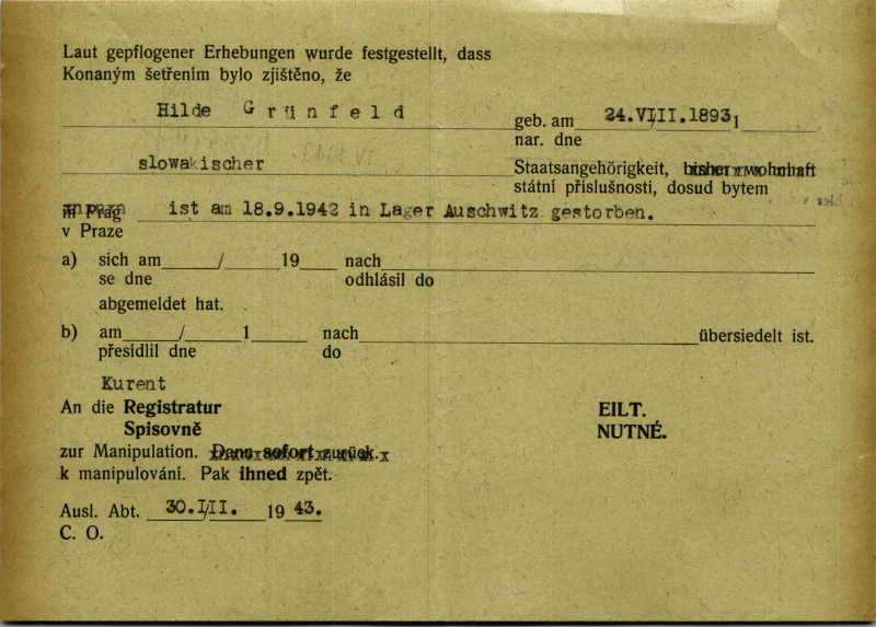 Grünfeldová Hilda: Zpráva o úmrtí