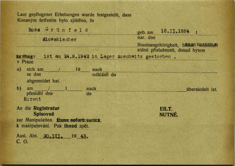 Grünfeldová Rosa: Zpráva o úmrtí