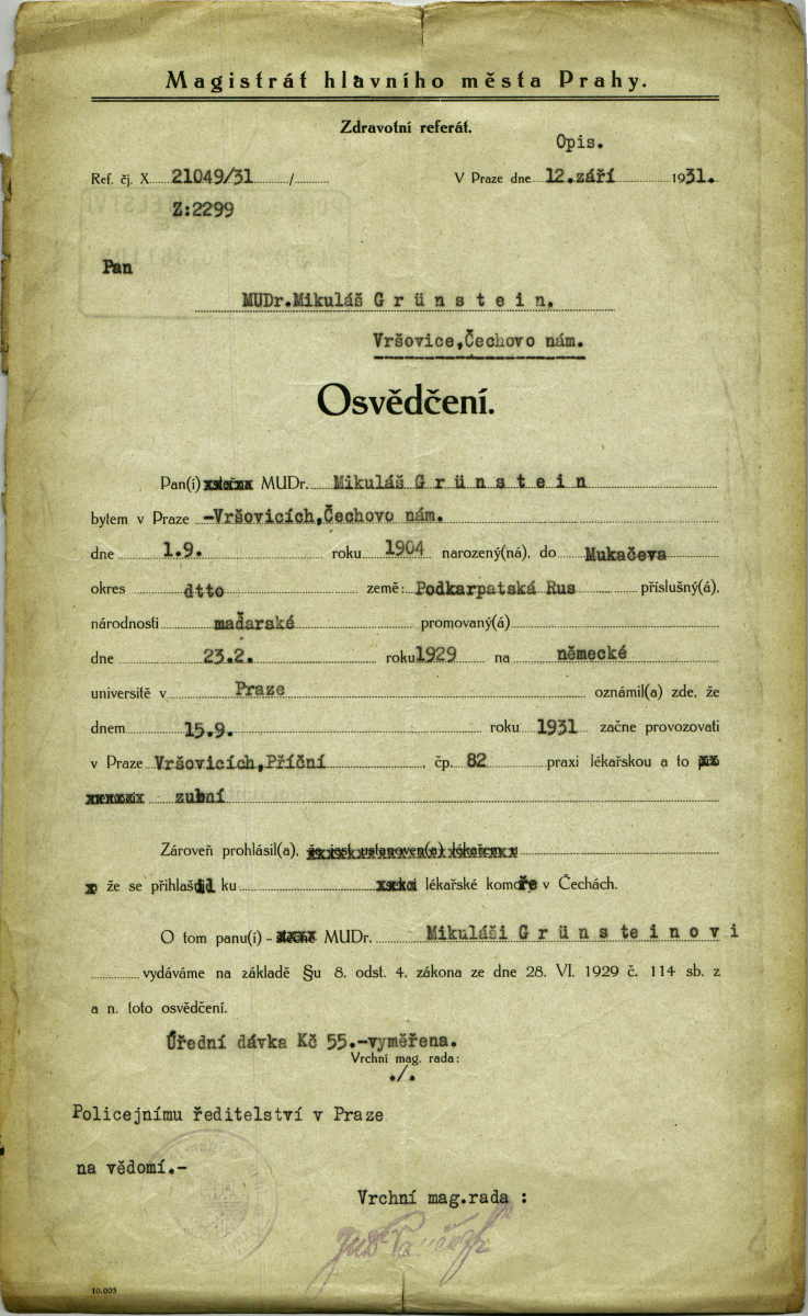 Grünstein Mikuláš: Přihlášení k lékařské komoře