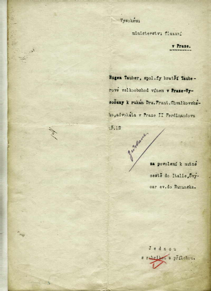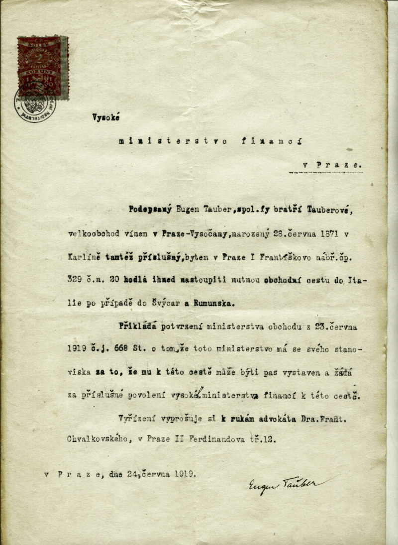 Tauber Eugen: Žádost o povolení k cestě do zahraničí
