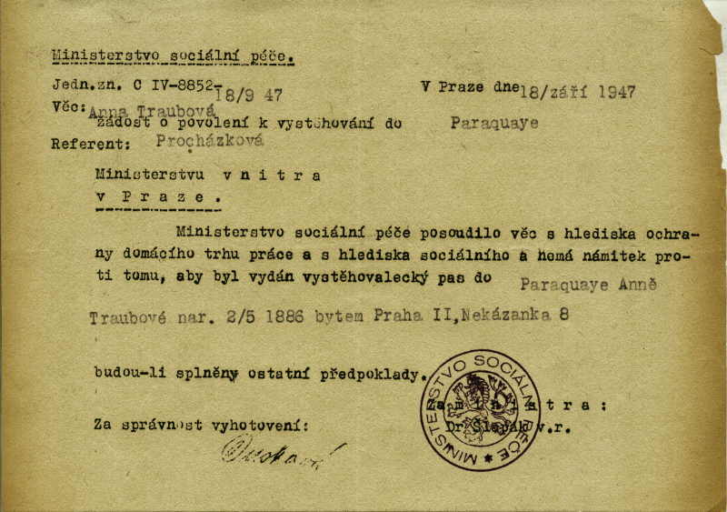 Traubová Anna: Souhlas s vydáním vystěhovaleckého cestovního pasu