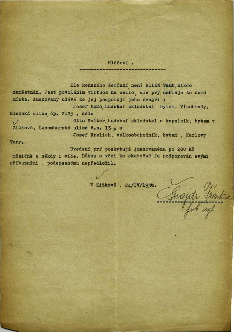 Taube Eliáš: Šetření o majetkových a výdělkových poměrech
