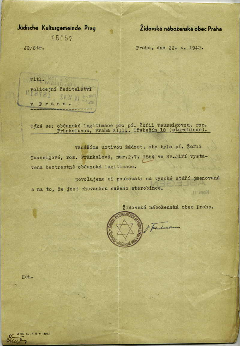 Taussigová Žofie: Žádost o beztrestné vydání občanské legitimace