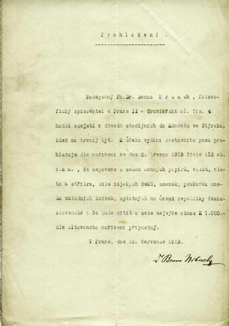 Urbach Beno: Prohlášení k žádosti o vydání cestovního pasu
