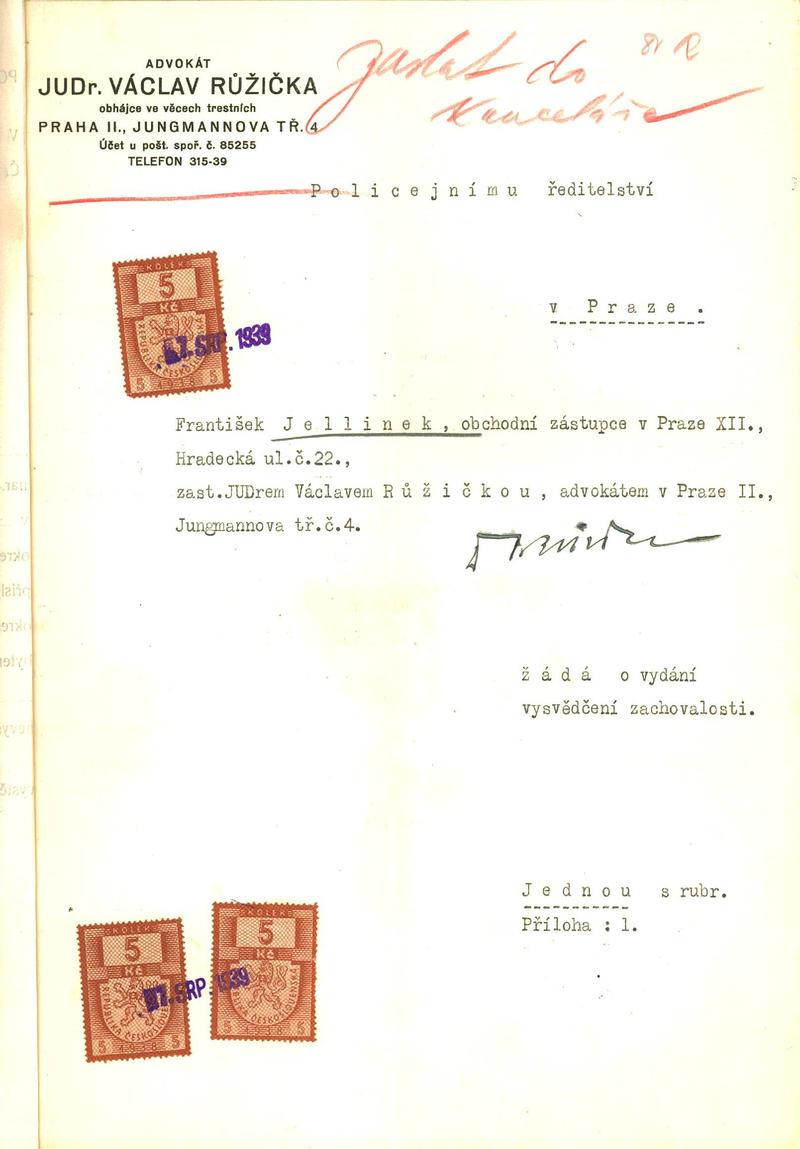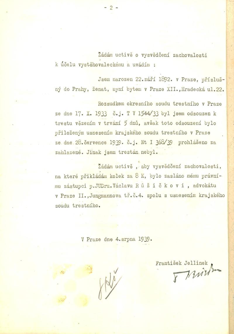 Jellinek František: Žádost o vystavení vysvědčení zachovalosti