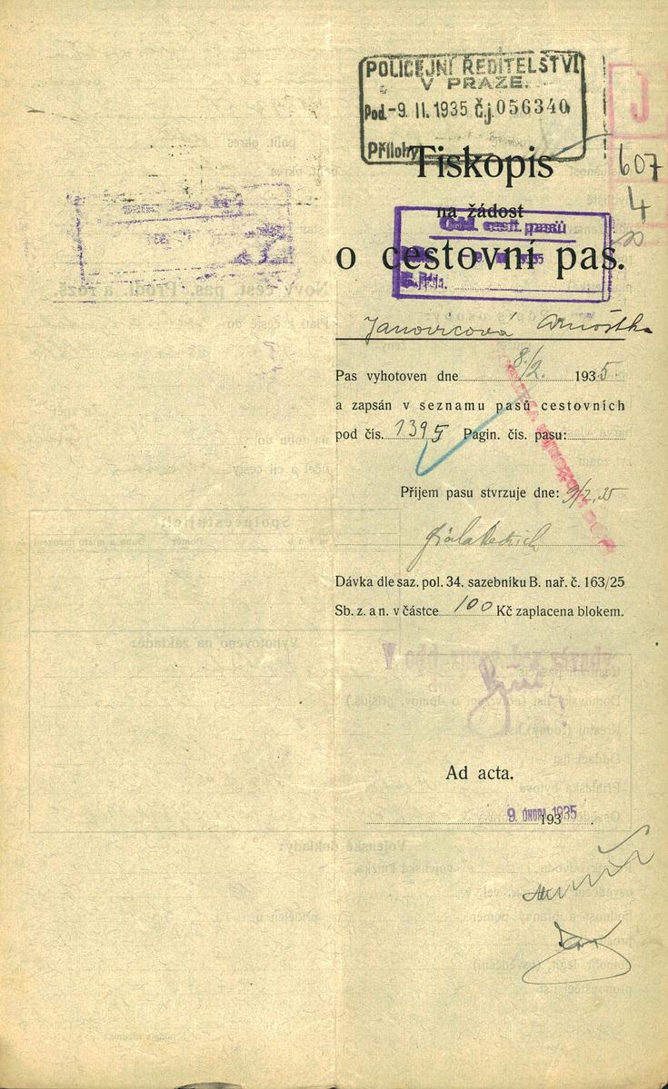 Janovicová Arnoštka: Žádost o prodloužení a rozšíření cestovního pasu
