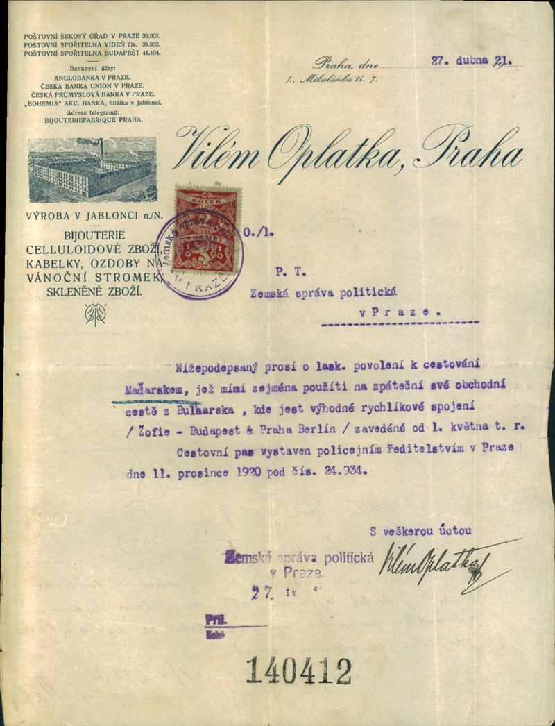 Oplatka Vilém: Žádost o rozšíření cestovního pasu