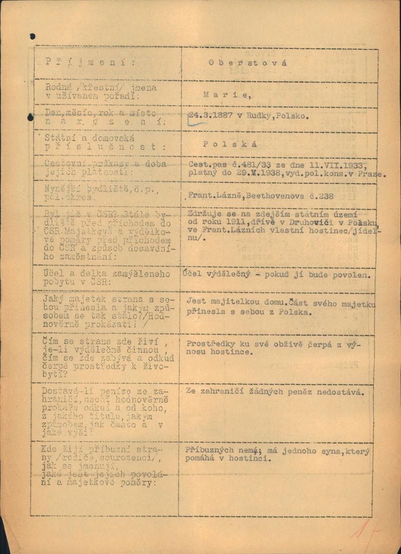 Oberstová Marie: Šetření k žádosti o povolení pobytu