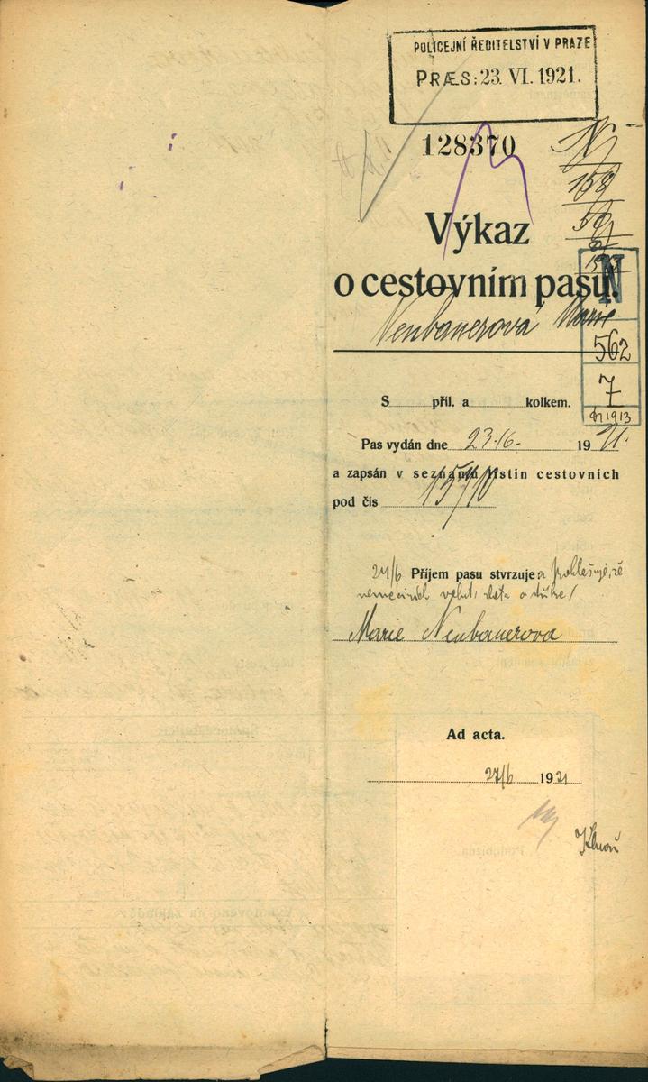 Neubauerová Marie: Žádost o vydání cestovního pasu
