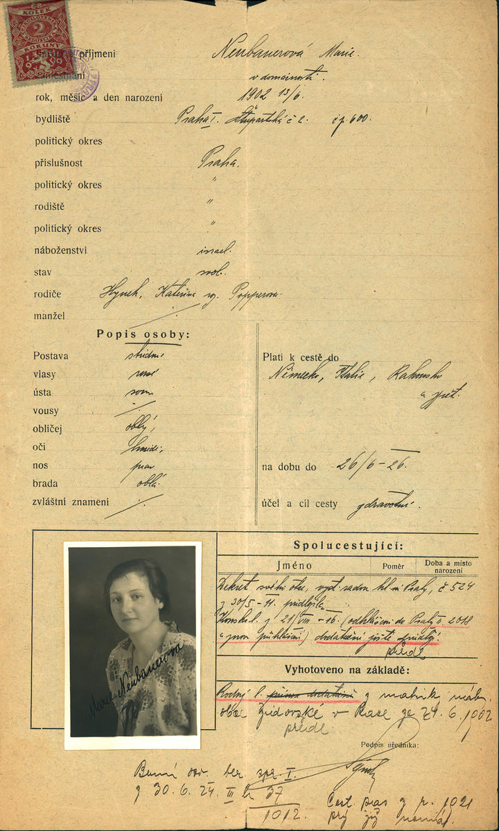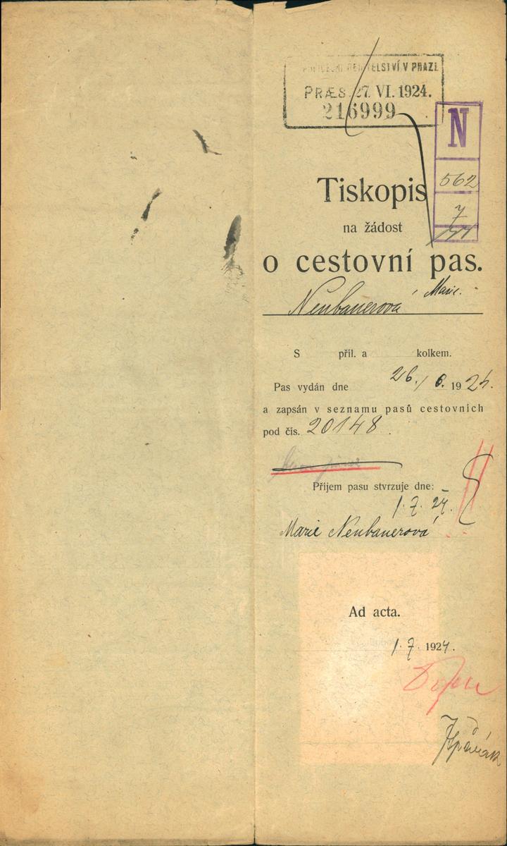Neubauerová Marie: Žádost o vydání cestovního pasu