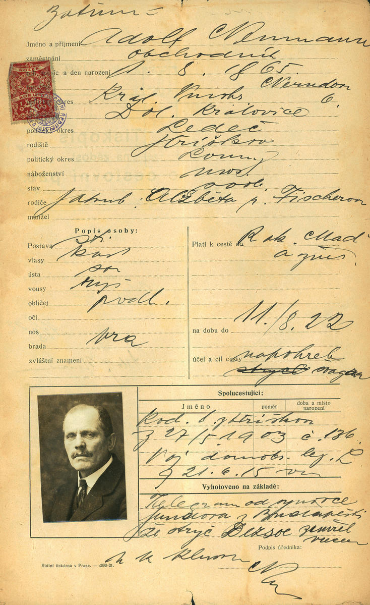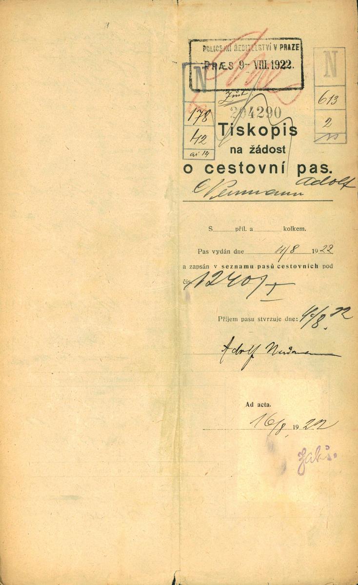 Neumann Adolf: Žádost o vydání cestovního pasu