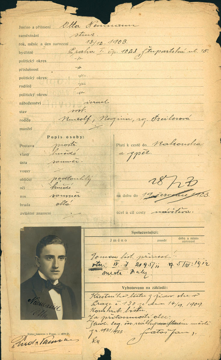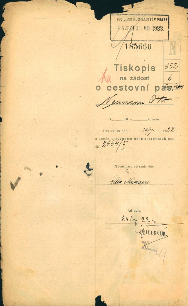 Neumann Otta: Žádost o vydání cestovního pasu