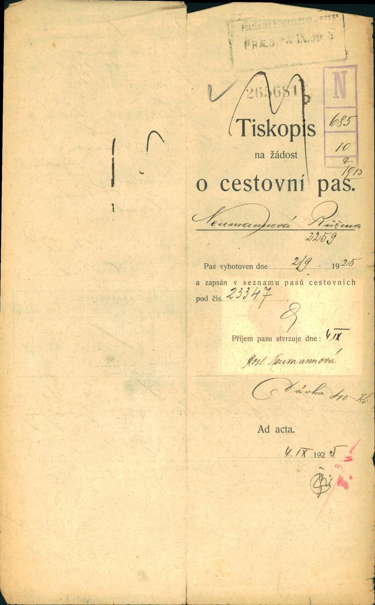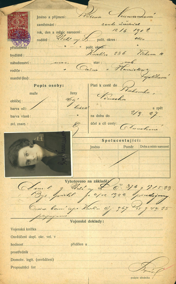 Neumannová Růžena: Žádost o vydání cestovního pasu