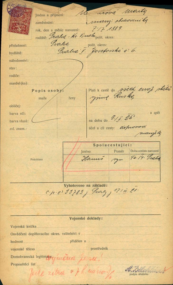 Neunerová Marta: Žádost o vydání cestovního pasu