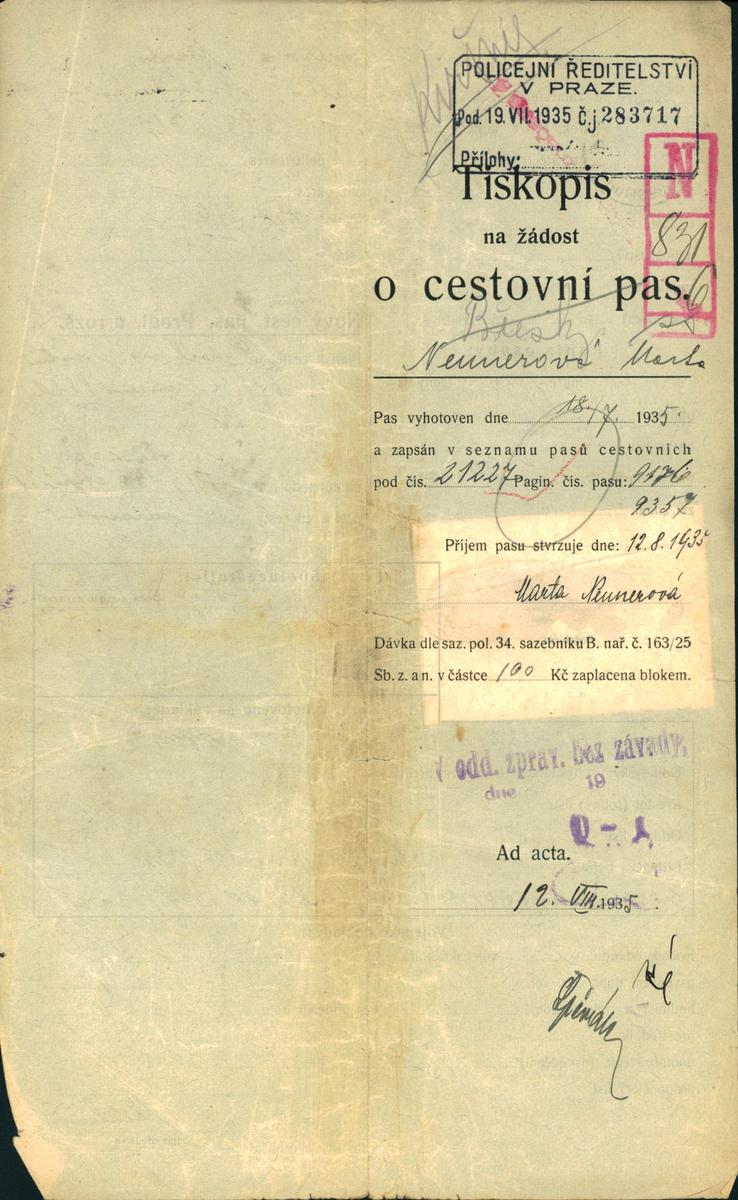 Neunerová Marta: Žádost o vydání cestovního pasu
