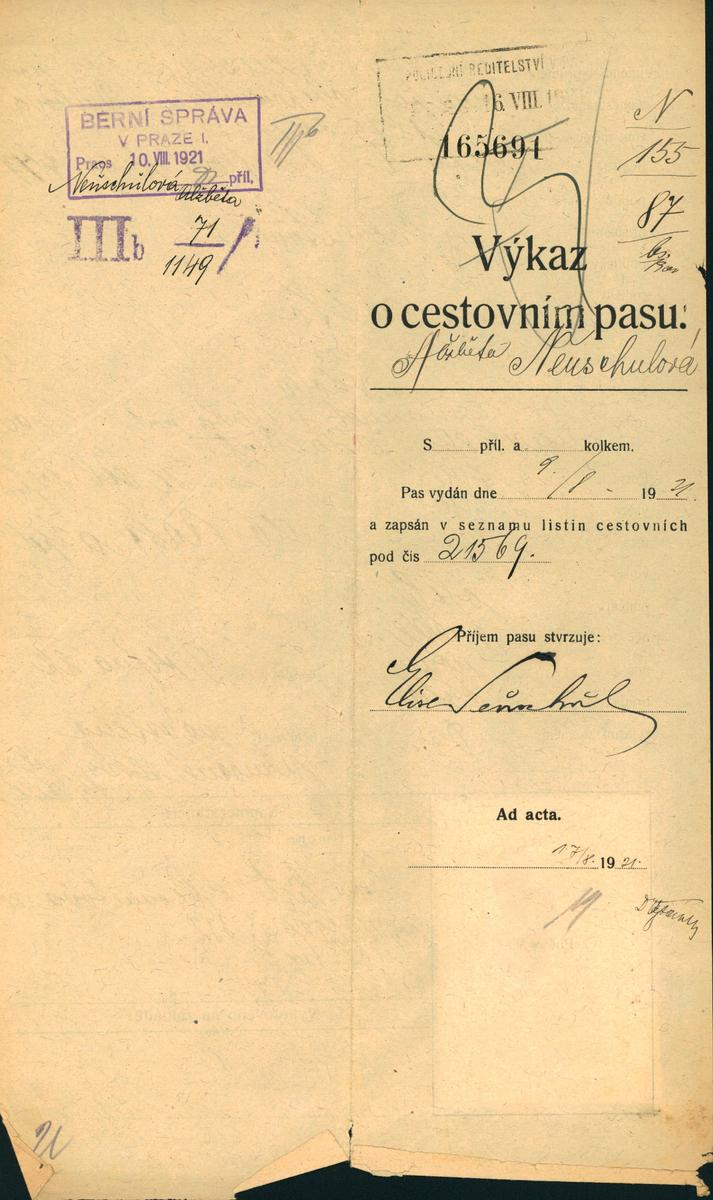 Neuschulová Elise: Žádost o vydání cestovního pasu