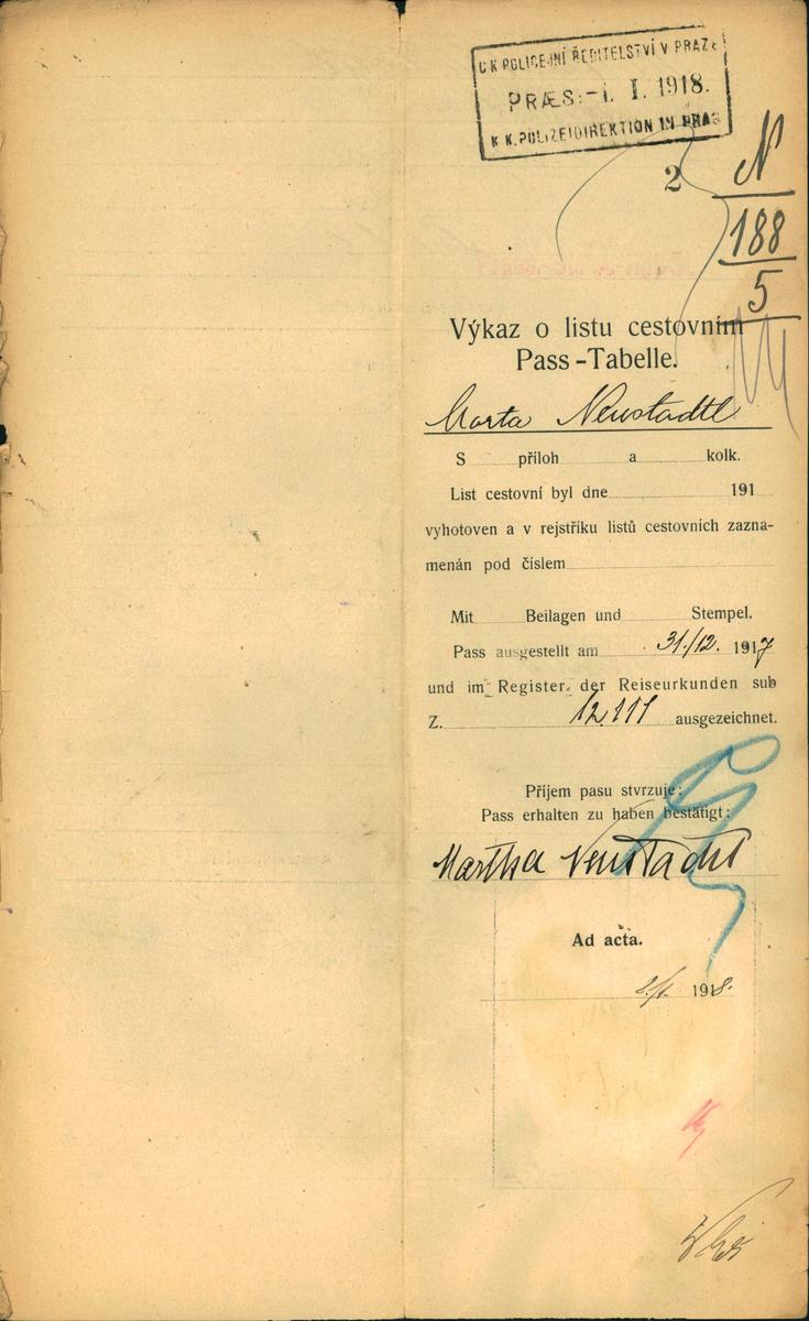 Neustadtlová Marta: Žádost o vydání cestovního pasu
