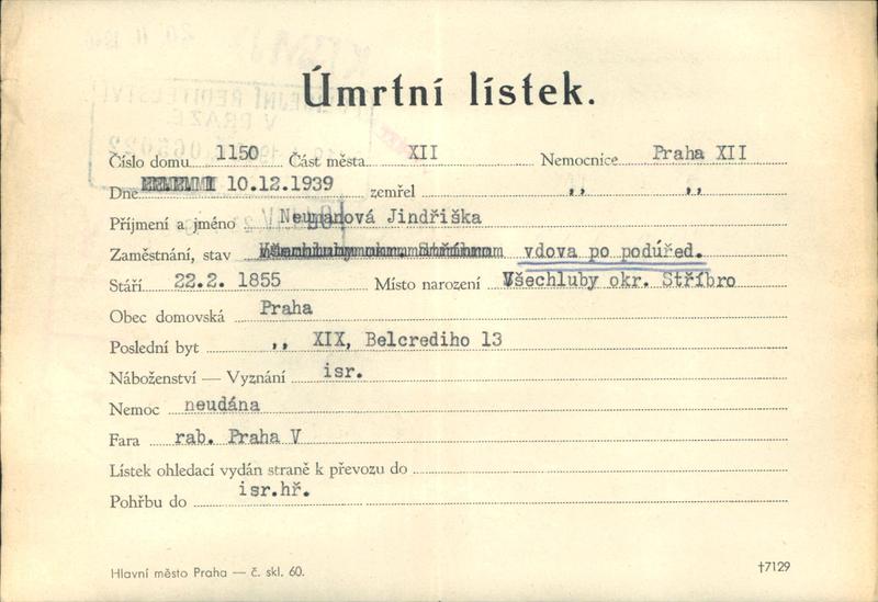 Neumannová Henriette: Úmrtní lístek