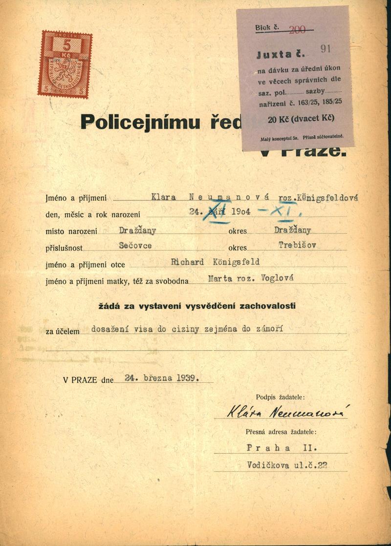 Neumannová Klara: Žádost o vystavení vysvědčení zachovalosti