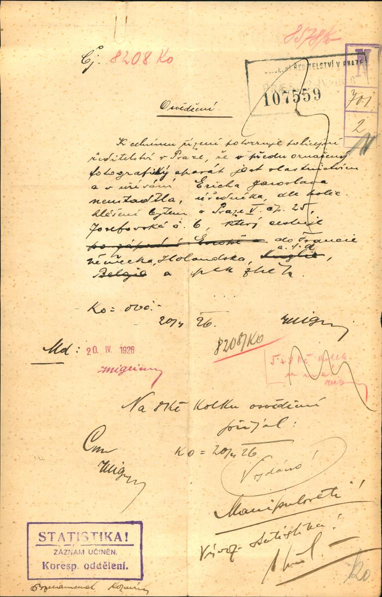 Neustadtl Erich Wiliam: Žádost o souhlas s převozem fotoaparátu