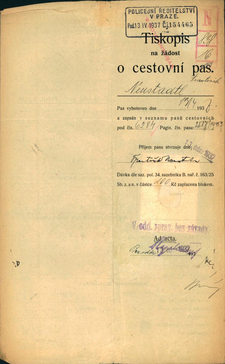 Neustadtl Franz: Žádost o vydání cestovního pasu