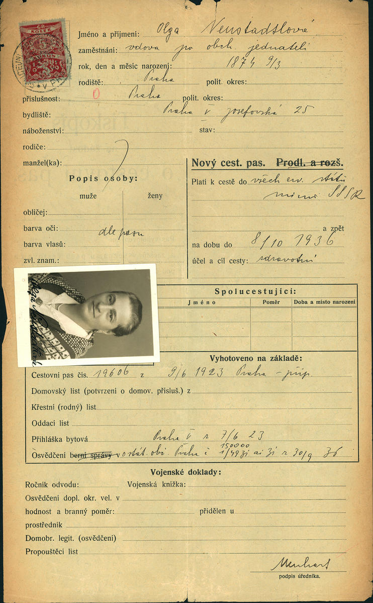 Neustadtlová Olga: Žádost o vydání cestovního pasu