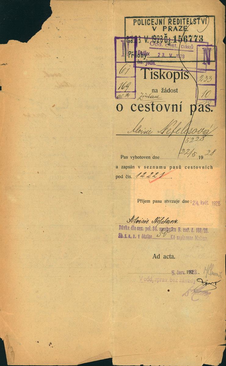 Nefelesová Aloisie: Žádost o vydání cestovního pasu