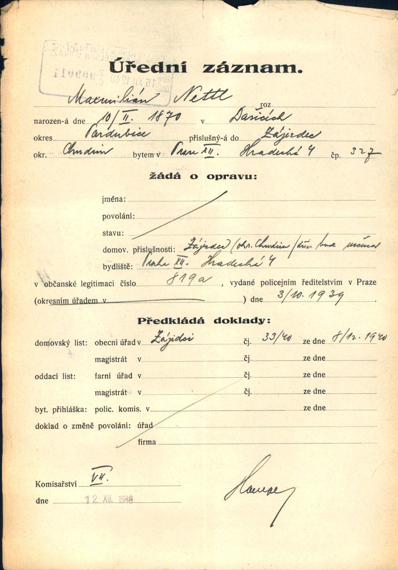 Nettl Maximilian: Žádost o opravu v občanské legitimaci