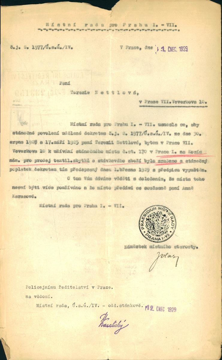 Nettelová Teresa: Zrušení povolení k používání místa stánečného