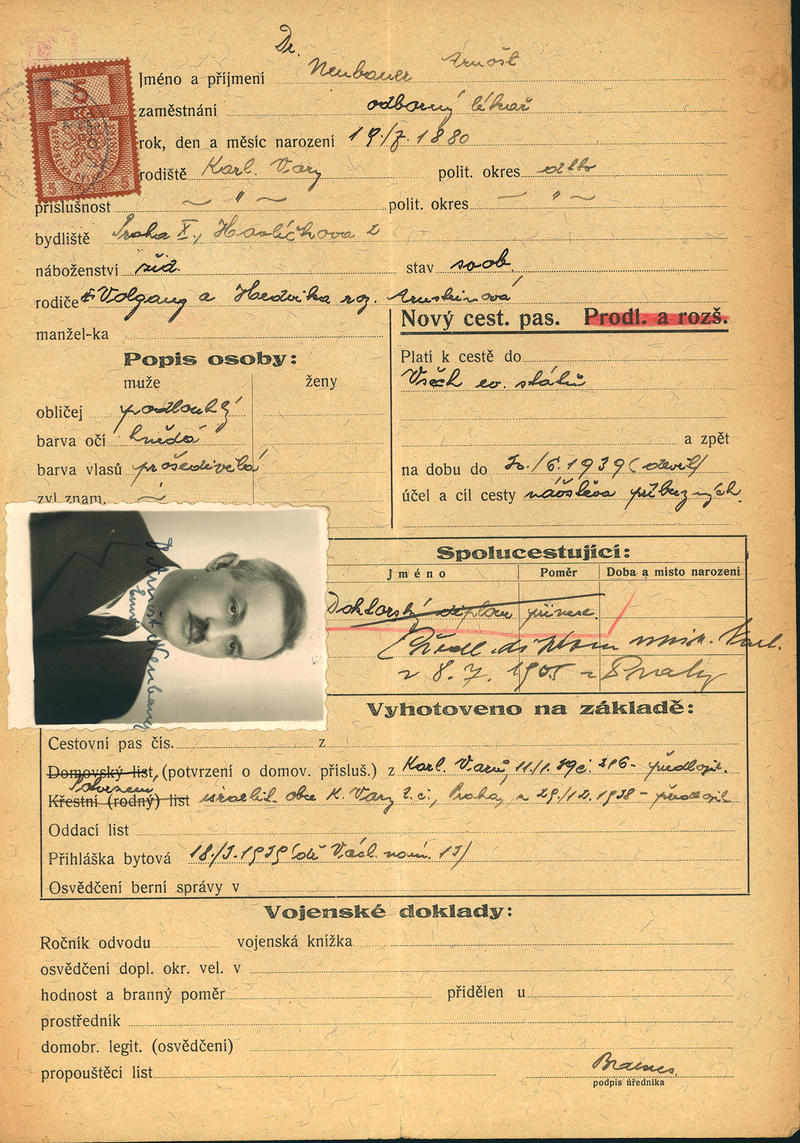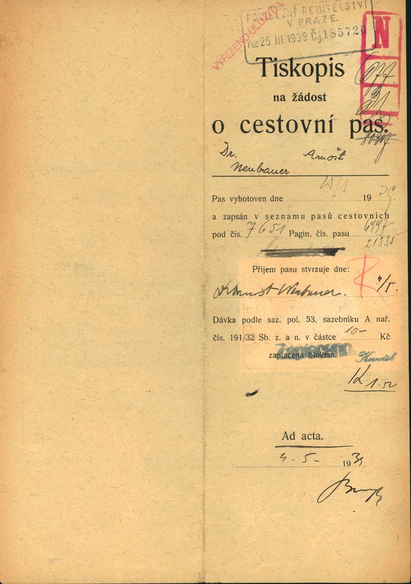 Neubauer Arnošt: Žádost o vydání cestovního pasu