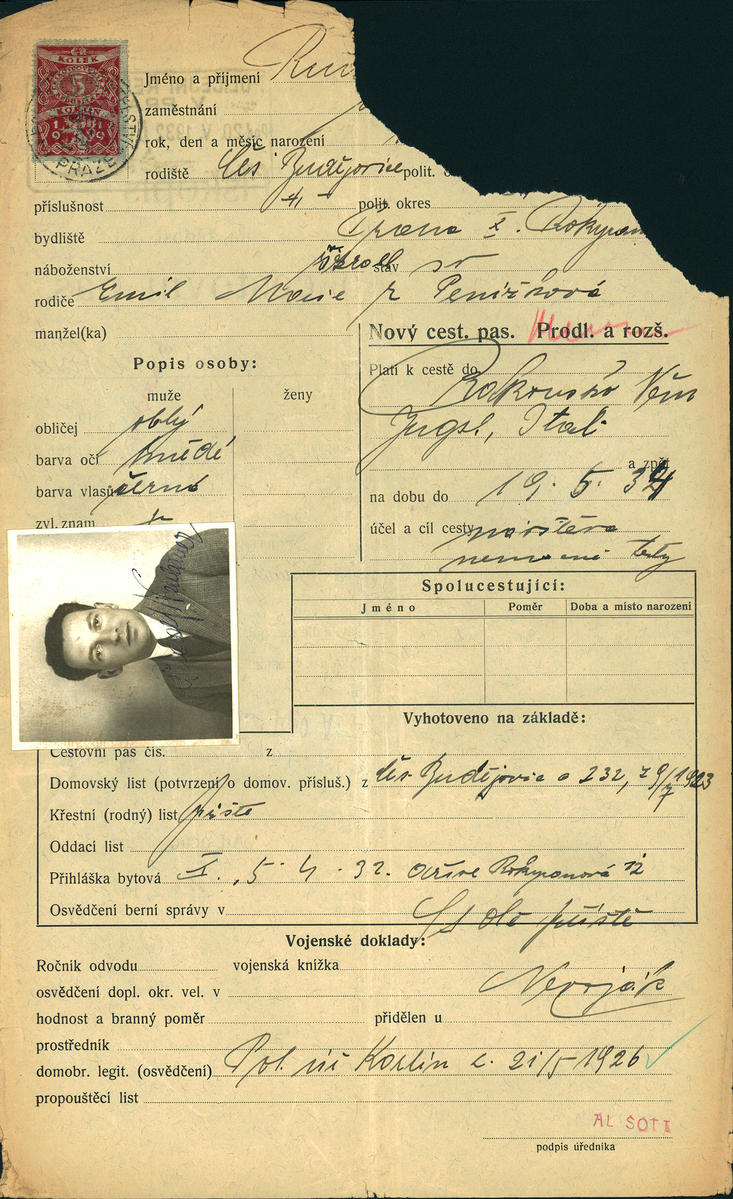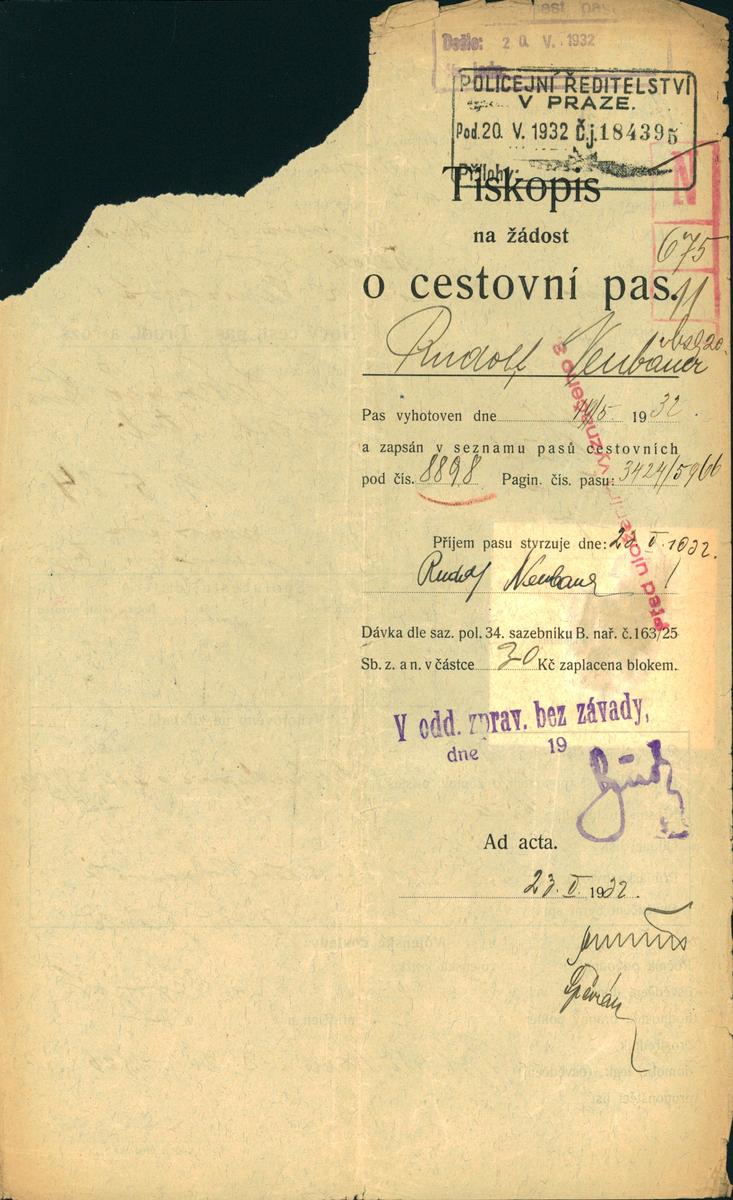 Neubauer Rudolf: Žádost o vydání cestovního pasu