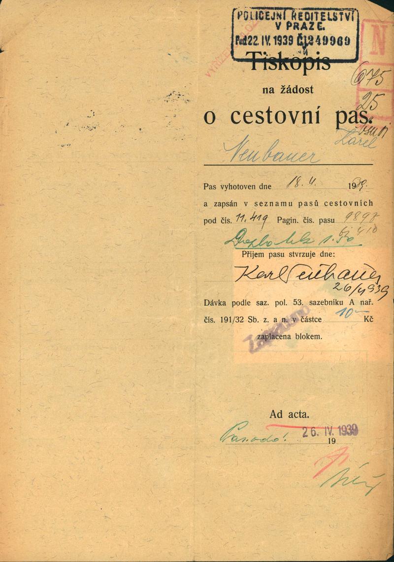 Neubauer Karel: Žádost o vydání cestovního pasu