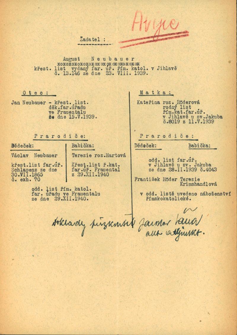 Neubauer Gustav: Šetření k žádosti o uznání árijského původu