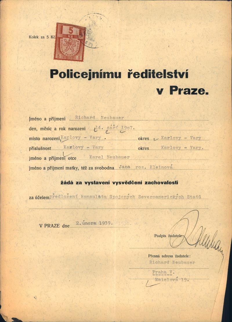 Neubauer Richard: Žádost o vystavení vysvědčení zachovalosti