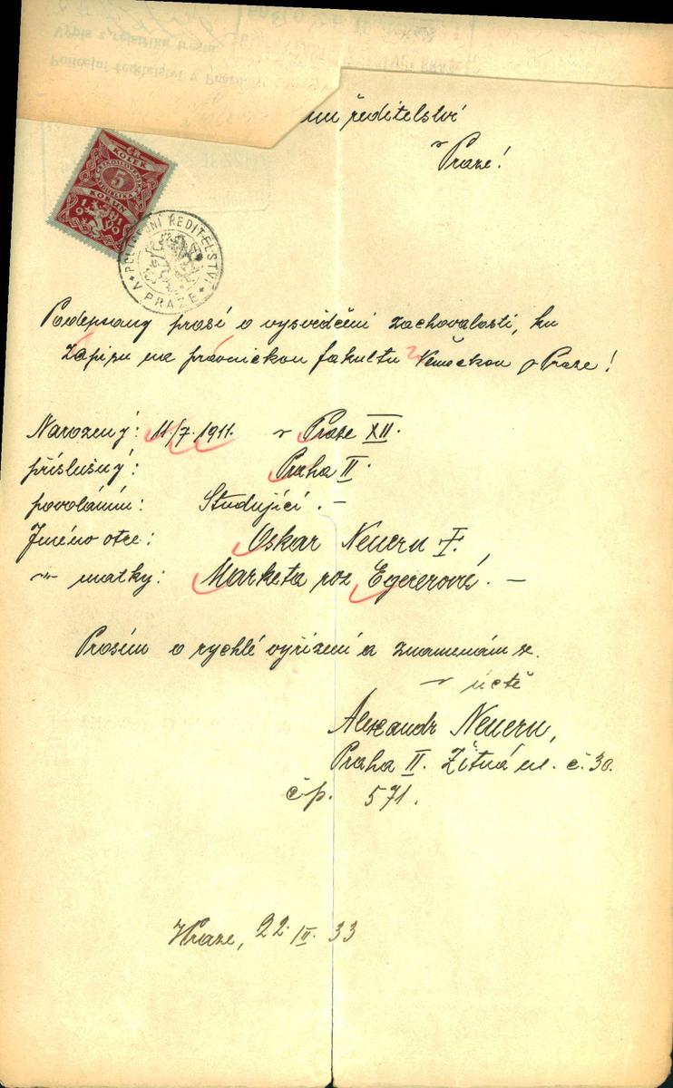 Neuern Alexander: Žádost o vystavení vysvědčení zachovalosti