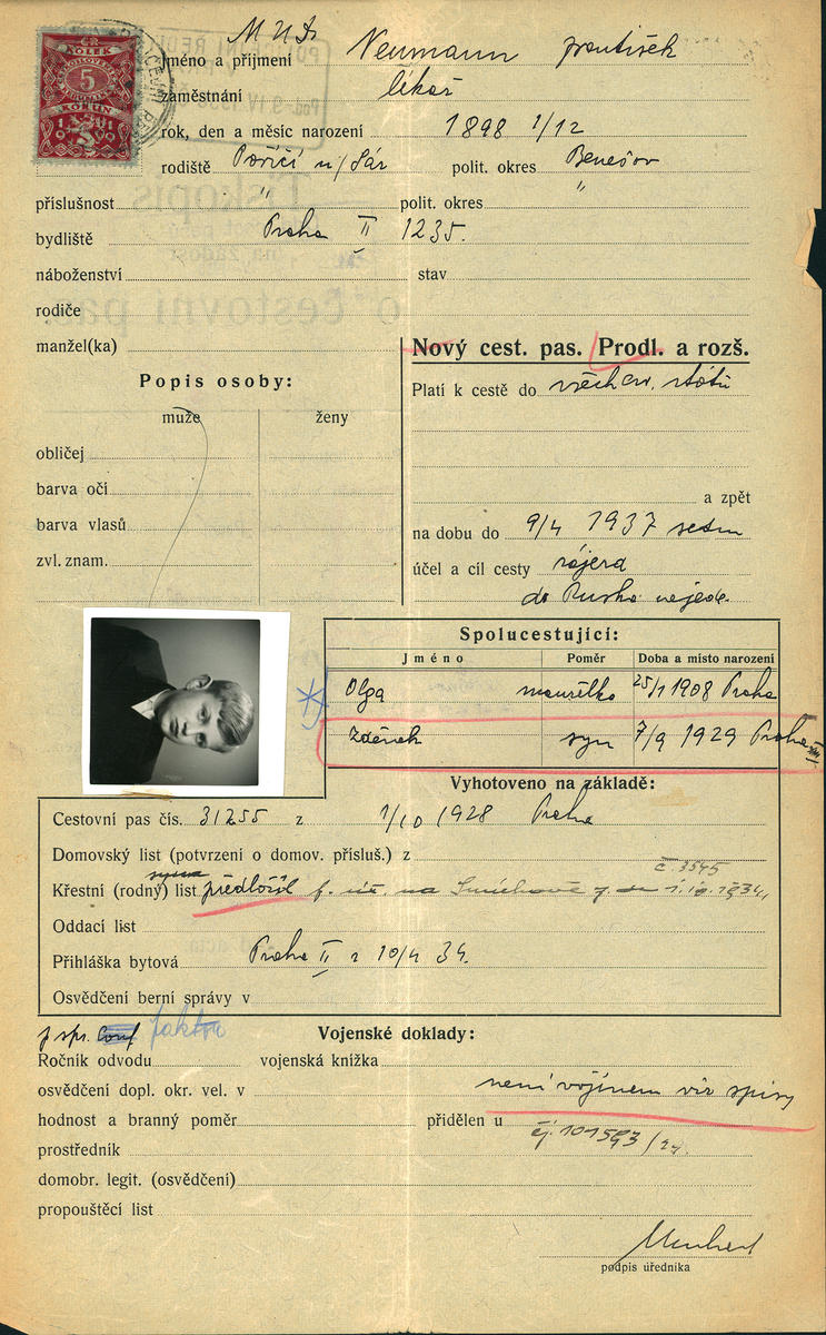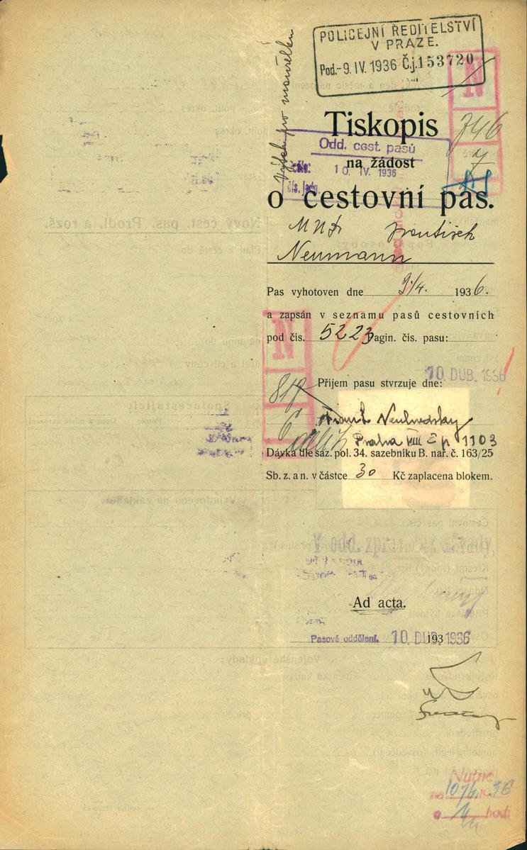 Neumann František: Žádost o prodloužení a rozšíření cestovního pasu